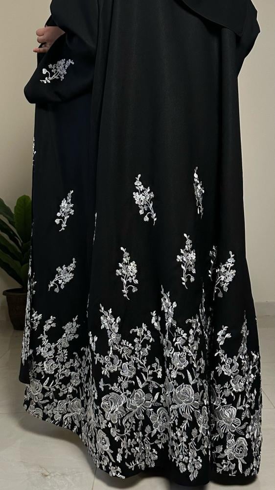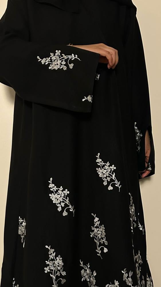 تتزين بتطريز فاخر بدقة متناهية, يزهر بنقوش ناعمة تمتد من الأكمام وحواف العباية, لتعكس ذوقاً رفيعاً إحساساً فنياً فريداً.